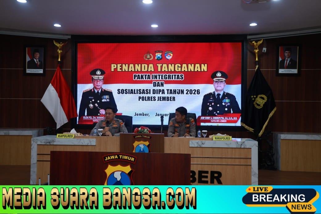 Mediasuarabangsa.com //JEMBER – Mengawali tahun 2026 dengan langkah tegas dan penuh komitmen, Polres Jember Polda Jatim melaksanakan penandatanganan Pakta Integritas bagi seluruh pegawai di lingkungan Polres Jember.