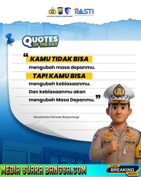 Mediasuarabangsa.com //BANYUWANGI – (5/01/2026) Satuan Lalu Lintas (Satlantas) Polresta Banyuwangi terus mengajak masyarakat untuk menumbuhkan kesadaran dan kedisiplinan berlalu lintas sebagai bagian dari budaya sehari-hari. Pesan tersebut disampaikan melalui Quotes of the Day oleh Kasat Lantas Polresta Banyuwangi, Kompol Elang Prasetyo.