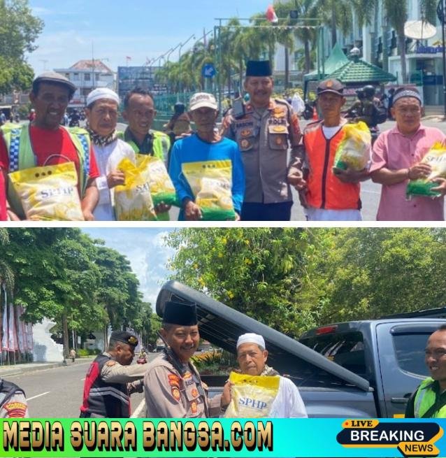 Usai kegiatan pengamanan, Kompol Basori Alwi bersama anggotanya melanjutkan dengan pembagian beras SPHP kepada juru parkir, tukang becak, petugas kebersihan, dan takmir Masjid Agung Banyuwangi.