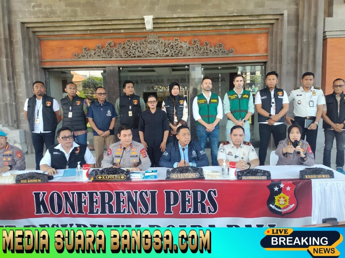 Mediasuarabangsa.com //Kapolda Bali Irjen Pol Daniel Adityajaya S.H., S.I.K., M.Si., bersama Ses NCB Interpol Indonesia Divhubinter Polri Brigjen pol Dr. Untung Widyatmoko, S.I.K., M.H., dan Kepala Kantor Imigrasi Kelas I Khusus TPI Ngurah Rai Bugie Kurniawan, S.IP., M.Si., didampingi Direskrimum Kombes Pol Dr. I Gede Adhi Mulyawarman S.I.K., S.H., M.H., Kabid Propam Ketut Agus Kusmayadi S.I.K., M.H, serta Kasubid Penmas AKBP Rina Isriana Dewi S.I.K., mewakili Kabid Humas, Konfrensi Pers di Loby Mapolda, selasa 31/3/2026.
