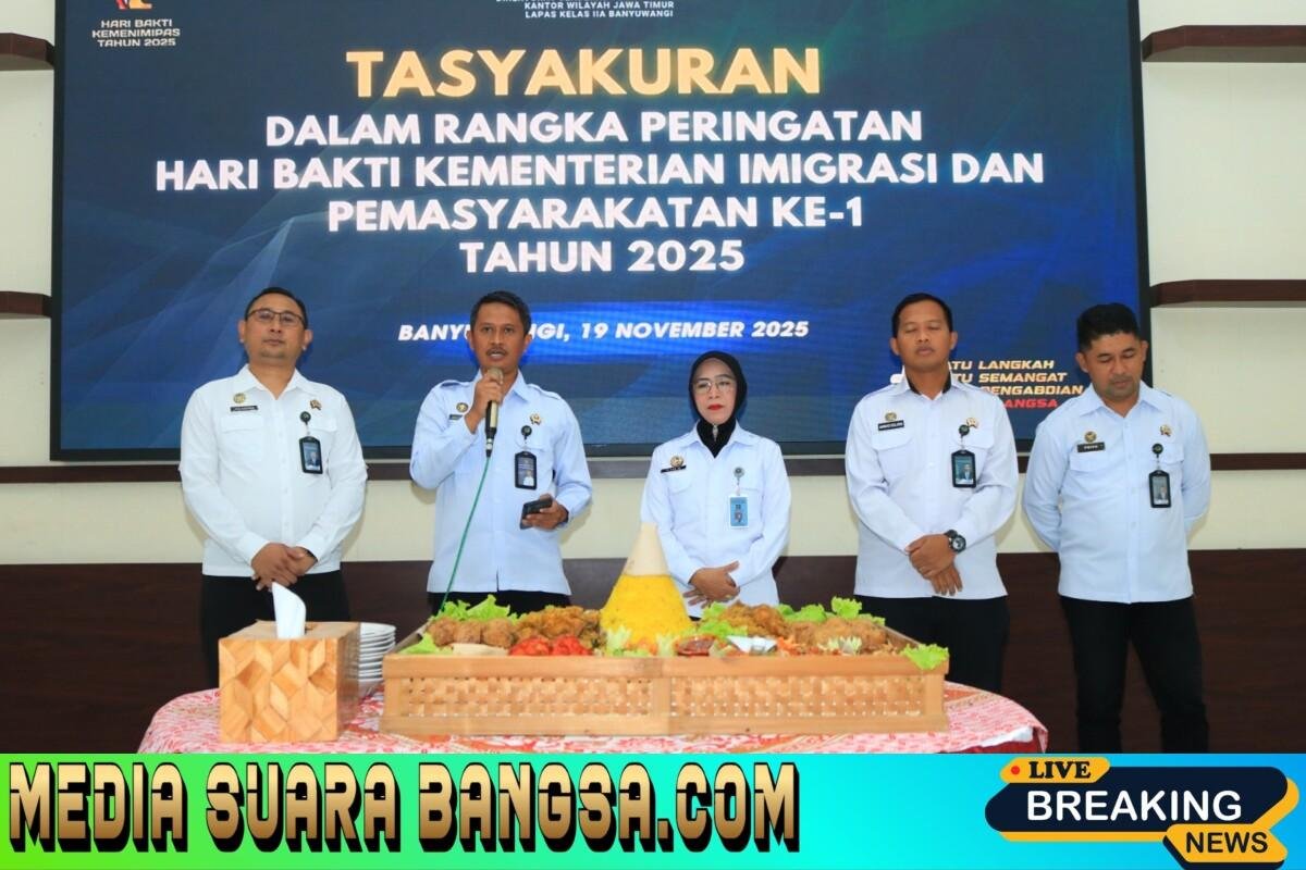Mediasuarabangsa.com //BANYUWANGI – Puncak peringatan Hari Bakti Kementerian Imigrasi dan Pemasyarakatan (Kemenimipas) ke-1 Tahun 2025 turut dilaksanakan oleh Lembaga Pemasyarakatan (Lapas) Kelas IIA Banyuwangi dengan menggelar acara tasyakuran. Acara yang diikuti secara khidmat oleh seluruh pegawai ini berlangsung di Aula Sahardjo Lapas setempat, Rabu (19/11).